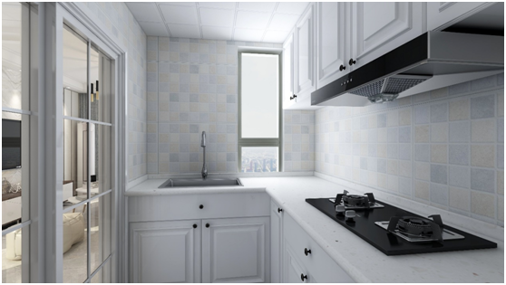這個廚房屬于L型廚房,首先先說明下L形的廚房布局是什么,這是指所有的工作區(qū)沿兩面挨著的墻布置,水盆放到窗戶一側(cè),操作臺和灶臺放在另一側(cè),形成一個三角的操作空間,符合清洗、加工、烹飪的順序。因為采光問題,整體柜子用的白色為主色調(diào),墻面用了淺色但又顯得豐富顏色的磚,使得整體空間沒有那么單一。
