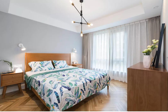 △臥室內(nèi)溫馨原木與清新被單的搭配相得益彰,一盞簡約個(gè)性的吊燈,像樹枝一樣,簡單明了的同時(shí)也有利于房間內(nèi)每個(gè)角度的采光。