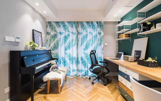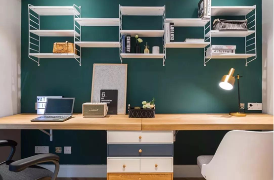 △位于客廳沙發(fā)背后的書房空間,灰色和青色的墻面形成對比,把鋼琴和書桌區(qū)域分開,墻面的置物架搭配雙人書桌的設(shè)計(jì),滿足了書房的收納需求
