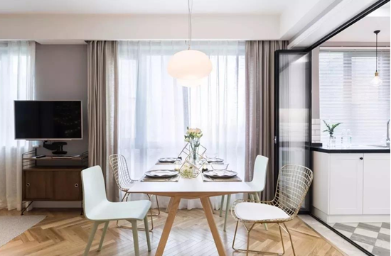 △客廳的整個(gè)色調(diào)分為三個(gè)部分,一是墻面的淺灰色,低調(diào)中又帶點(diǎn)清新,二是吊燈的暖白色,干凈大氣,三是地板上的木色,三個(gè)顏色形成三個(gè)大色塊??筒蛷d地面都是相同人字拼接的木地板,讓整個(gè)空間的整體感和縱深感得以提升。