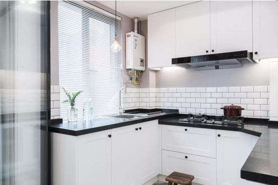 △用折疊式玻璃門將廚房和餐廳隔開,玻璃門既阻擋了油煙的蔓延,又保證了廚房的采光通透性,有利于做飯時(shí)家人之間的溝通。廚房門旁邊的仙人掌在空間上也起到了一定的隔斷作用。廚房內(nèi)部是U字型的櫥柜布局,白色的柜體、黑色的臺面、小白磚、灰色墻漆的運(yùn)用,讓廚房層次分明,折疊門的使用也讓廚房平時(shí)更顯寬敞。