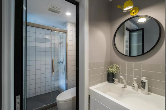 △衛(wèi)生間做了干濕分離,把洗手臺外移到衛(wèi)生間門外。地面和墻面還是主色調(diào)低調(diào)的淺灰色。馬桶和淋浴區(qū)之間也做了隔斷,再也不用擔(dān)心水汽的煩惱。圓形鏡子上有一個(gè)黃色的小臂燈,用來補(bǔ)充照明?!骷儼咨南词峙_和墻面的淺灰色小磚形成對比,臺面上放置了一個(gè)小花瓶,作為裝飾。