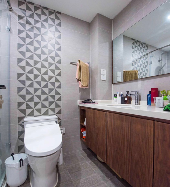衛(wèi)生間的深淺搭配看起來(lái)很舒服,深色木質(zhì)浴室柜看起來(lái)更有質(zhì)感,淺色墻磚搭配深色腰線使整體空間更具層次感,坐便后面的背景設(shè)計(jì)使得整體空間看上去不再單調(diào)。整個(gè)衛(wèi)生間以業(yè)主的生活習(xí)慣為出發(fā)點(diǎn),簡(jiǎn)潔大氣并具有功能性。