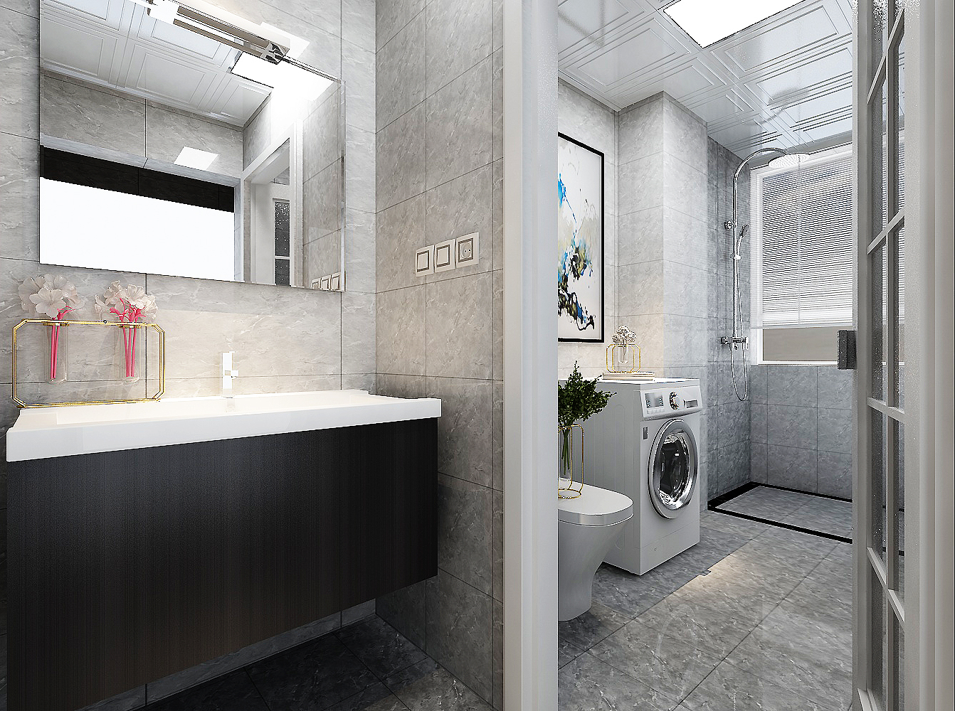 衛(wèi)生間采用深灰的墻地磚,因為這個磚也是深色系,鋪完之后整體很高檔,因為衛(wèi)生間本身就是容易臟的空間,建議是采用色調(diào)比較深的瓷磚,這樣的話整體效果較好而且好打理,衛(wèi)生間是接近正方形,所以洗衣機與浴室柜對面放也沒有問題,空間利用更合理,灰色版的墻磚,層次感更強。