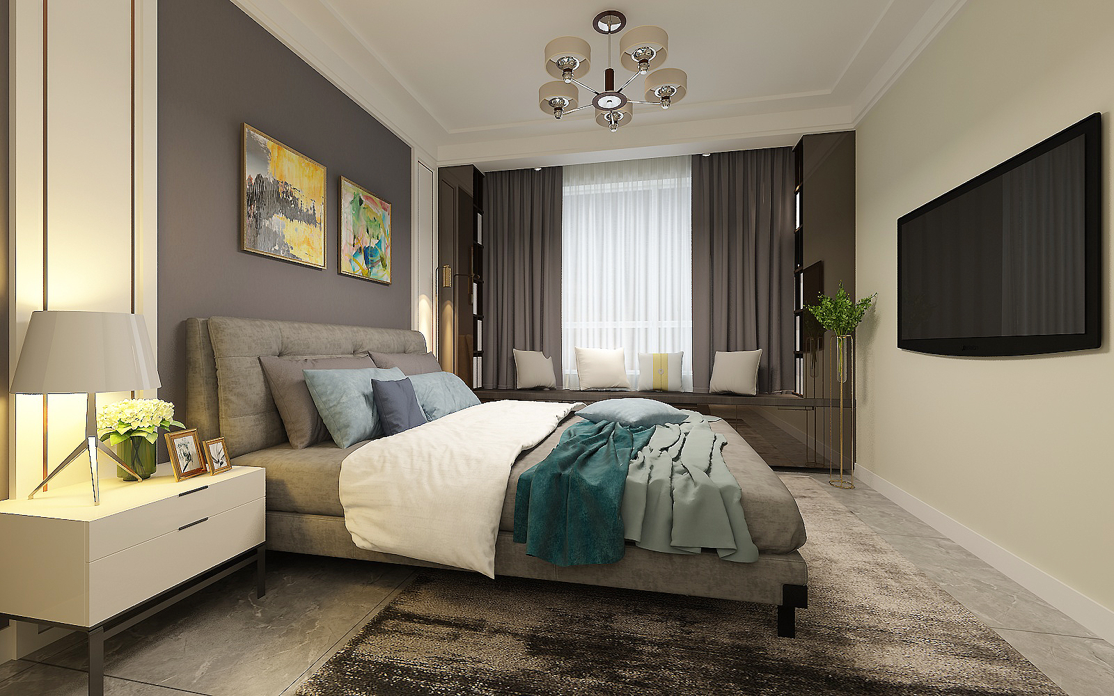 主臥室面積不算小,在墻漆顏色上與客廳不同,采用比較溫馨的暖灰色,這個顏色既有保護眼睛的作用,又可以增加人的睡眠質(zhì)量,是很慵懶的一個顏色,效果也不非常好,這是經(jīng)過多次的實踐證明。在空間布局上,把大衣柜放到了電視墻的對面,這樣不僅使得衣柜能過做到最大化,增加儲物,有使室內(nèi)活動區(qū)域很寬松,不擁擠,也很溫馨,是目前大多數(shù)年輕人的選擇。